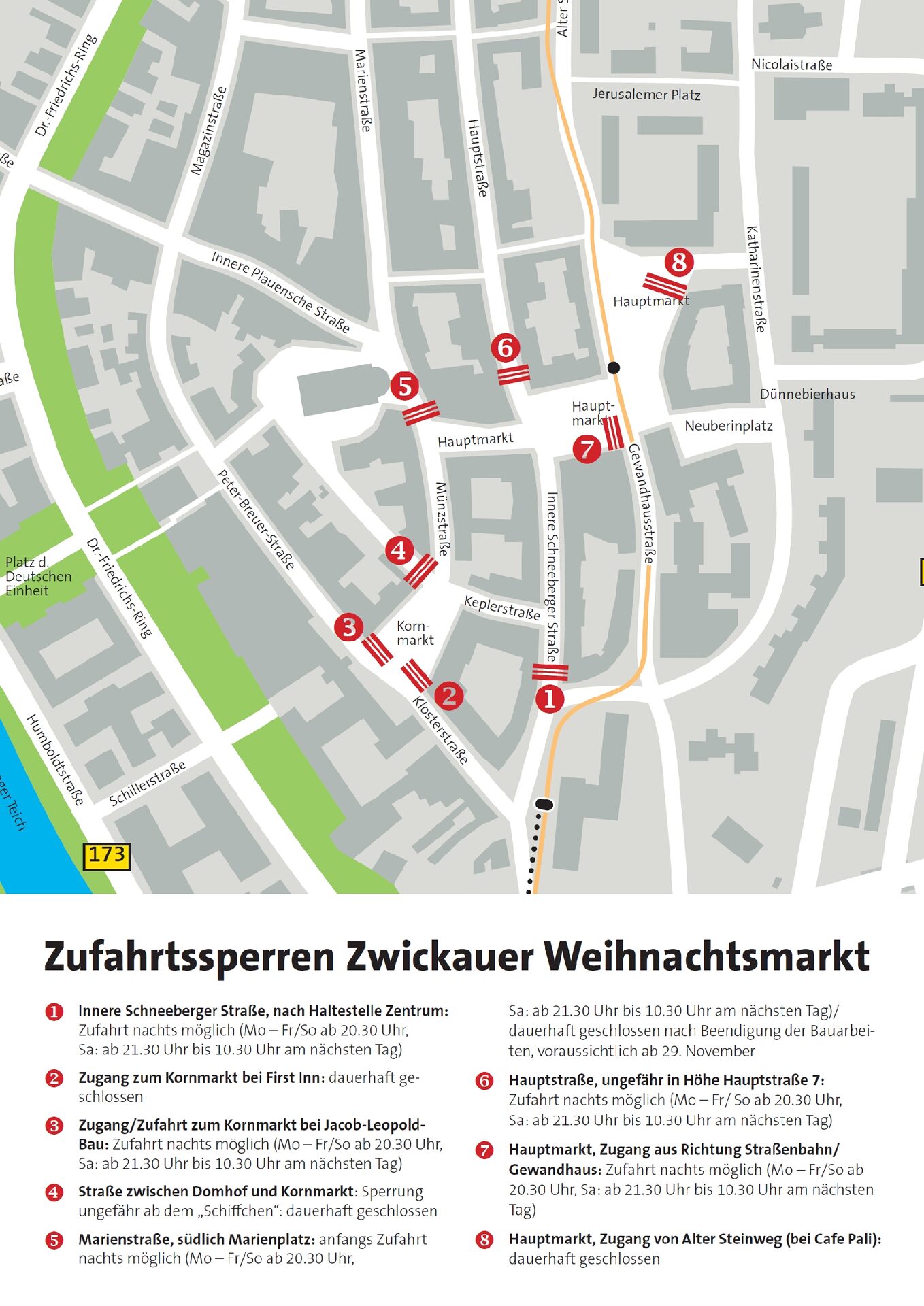 Um die angenehme Atmosphäre des Marktes zu sichern, ist das Marktgebiet wie in den vergangenen Jahren zu den Öffnungszeiten für den Fahrverkehr gesperrt. In diesem Jahr kommen zusätzlich zu den Verkehrsschildern die zertifizierten Zufahrtssperren zum Einsatz. Eine Zufahrt für Anlieger oder für Lieferverkehr ist über bestimmte Zufahrten nach dem täglichen Ende des Weihnachtsmarktes bis zum nächsten Morgen möglich. Ab 10.30 Uhr müssen jedoch die Fahrzeuge das abgegrenzte Gebiet wieder verlassen haben. Hier gibt es nähere Infos.